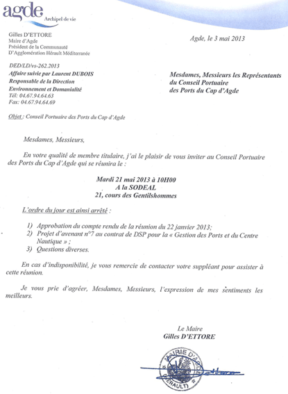 C’est la première fois qu’une telle situation se produit alors que pendant dix ans cet élu a été le Président de l’Association des usagers des ports de plaisance du Cap d’Agde, UPCA, qu’il siège au CLUPP et au Conseil portuaire depuis 1995 et qu’il n’a pas manqué d’intervenir chaque fois que les intérêts des plaisanciers étaient en jeu.