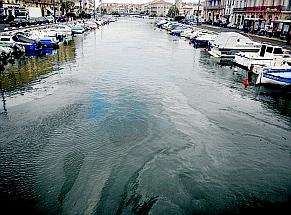 Cela faisait longtemps. Et entre nous, on n'était pas pressé de la revoir. Toujours est-il qu'hier matin une nappe de carburant a traversé le Cadre en direction de l'étang de Thau avec son cortège d'odeur et ses couleurs irisées. En remontant ce fil d'odeur, cette nappe prenait sa source d'un des bateaux amarrés au quai Maximin-Liciardi.