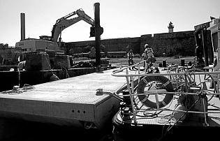 Stocké le long d'une digue située près de la capitainerie, le nouveau ponton du fort de Brescou a été transféré mardi matin au large du Cap-d'Agde par la barge de la société Buesa, forte de ses 1 200 chevaux de puissance.